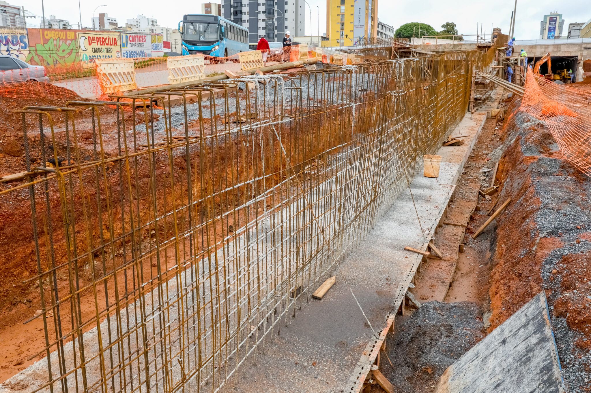 “Para diferenciar os dois muros, chamamos um de sul e outro de norte”, explica Everaldo Barros, um dos engenheiros civis que atuam na obra do Túnel de Taguatinga. “O muro sul tem avançado mais rápido – temos 60 m de base pronta e já iniciamos a concretagem dos próximos 20 m do paredão”. A continuidade da construção do muro norte depende de novas escavações.