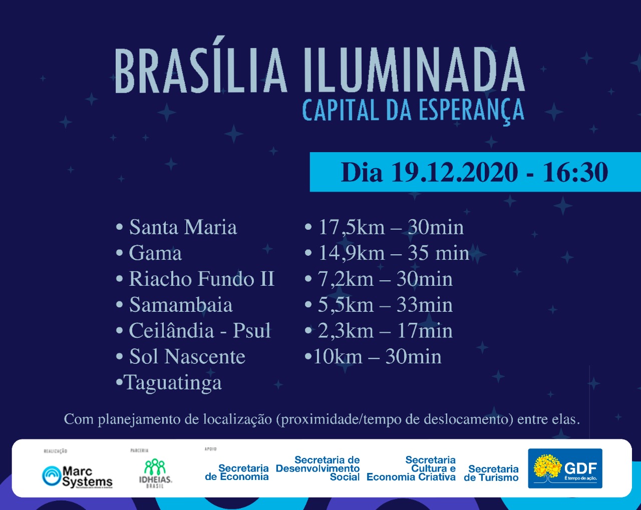 Lançado na última sexta-feira (18), o projeto Brasília Iluminada vai levar o Papai Noel em todas as cidades do DF. Todo o itinerário do trenó e sua passagem pelas regiões administrativas está disponível nas artes abaixo.