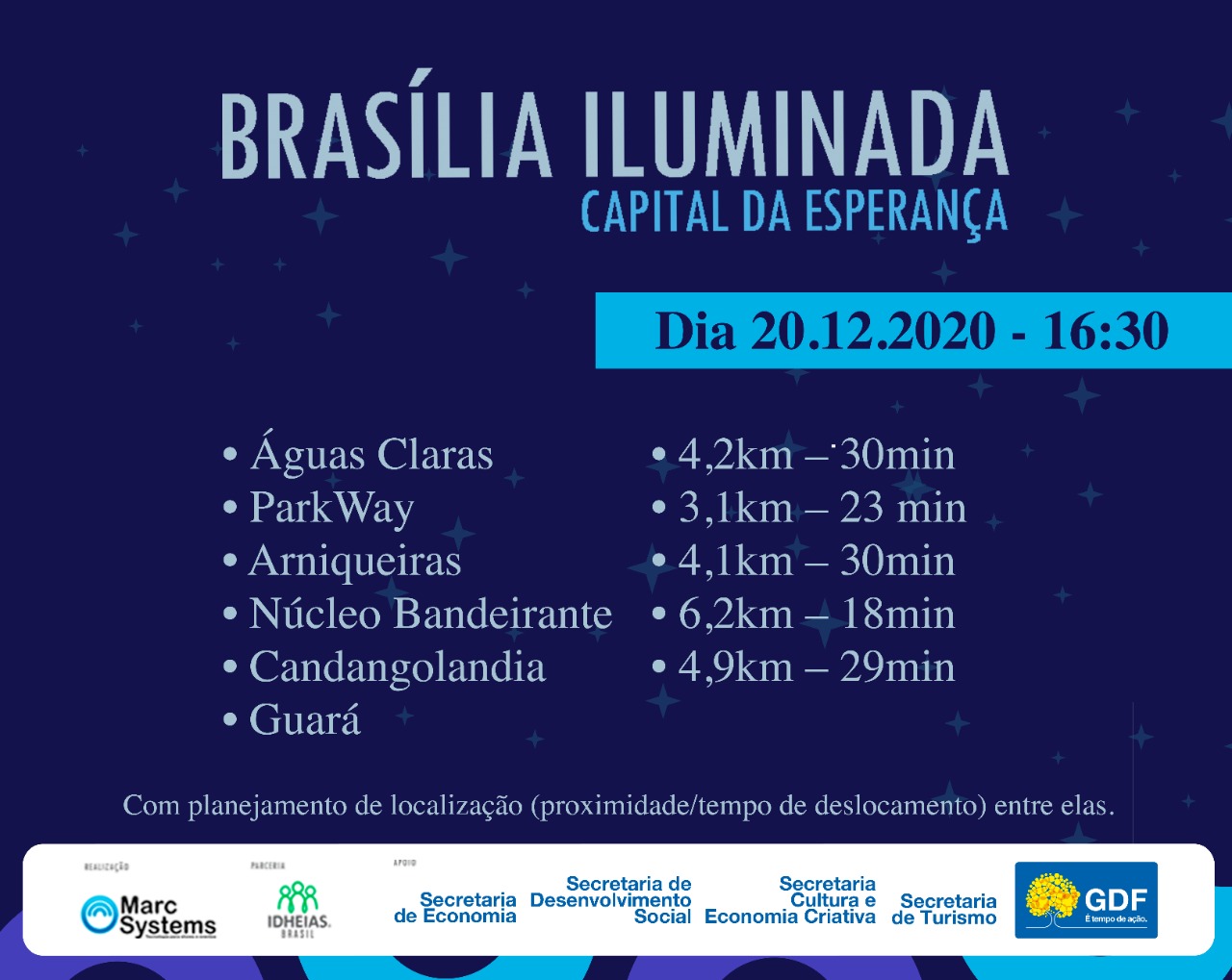 Além da passagem do Trenó do Papai Noel por todo o Distrito Federal, o projeto Brasília Iluminada traz um conceito diferente para o Natal de 2020. O projeto une a magia dessa época do ano com a celebração dos 60 anos de Brasília. A decoração valoriza elementos que caracterizam os traços da identidade brasiliense, como a arquitetura e o Cerrado.
