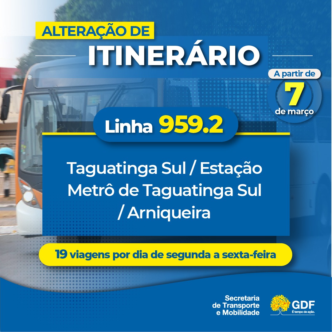 A linha de ônibus 959.2, que faz o percurso circular entre o Terminal de Taguatinga Sul e Arniqueira, terá a rota ampliada a partir desta segunda-feira (7). O objetivo é que os veículos da linha sigam até a estação do metrô mais próxima para que a integração com o Plano Piloto e com as outras regiões da cidade sejam facilitadas.