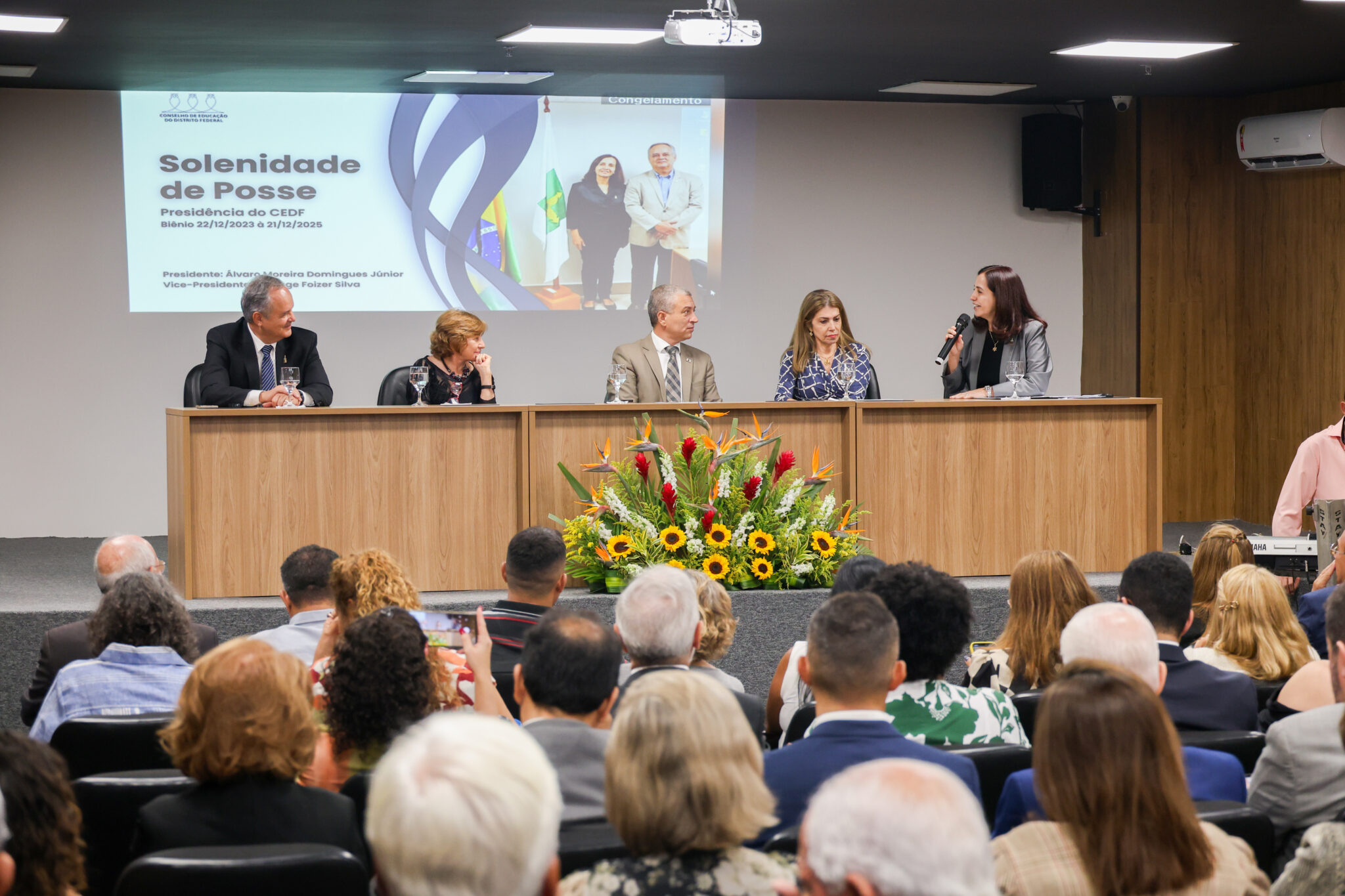 A nova presidência do Conselho de Educação do Distrito Federal (CEDF) tomou posse na tarde desta terça-feira (30) durante uma cerimônia realizada no Espaço Cultural Professora Neusa França, da Secretaria de Educação (SEE-DF). A posse do novo presidente, Álvaro Domingues Júnior, e da vice, Solange Foizer, foi oficializada pelo secretário de Educação em exercício, Isaías Aparecido. Autoridades, deputados e representantes da Educação estiveram presentes ao evento.