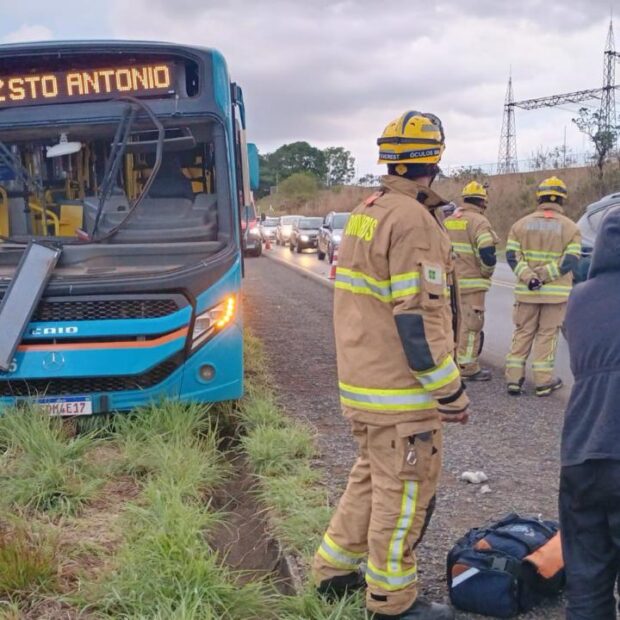 O Corpo de Bombeiros Militar do Distrito Federal (CBMDF) atendeu, na tarde deste domingo (19/10/2025), por volta das 17h30, uma ocorrência de acidente envolvendo um ônibus com destino à cidade de Santo Antônio do Descoberto (GO), que colidiu contra um poste de iluminação pública na BR-060, sentido Goiânia.