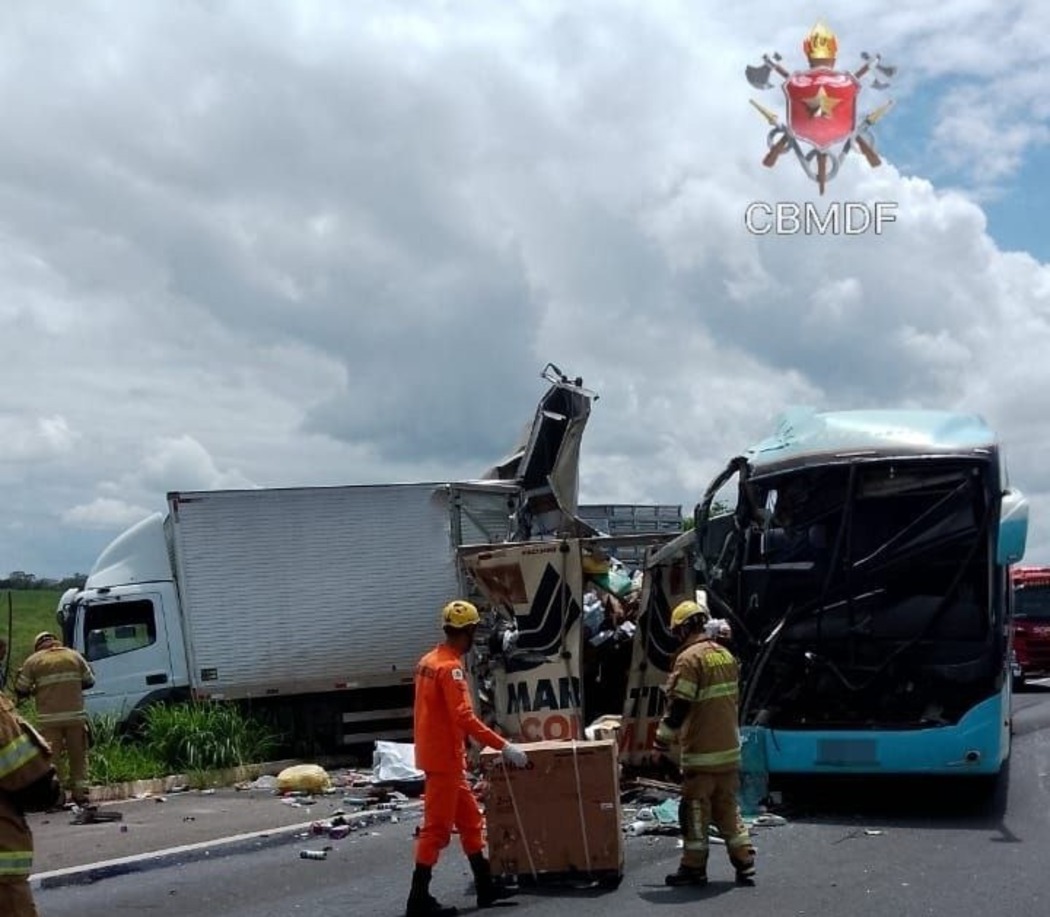O Corpo de Bombeiros Militar do Distrito Federal (CBMDF) atendeu, no início da tarde desta segunda-feira (29), uma colisão entre um ônibus e um caminhão baú na BR-020.
