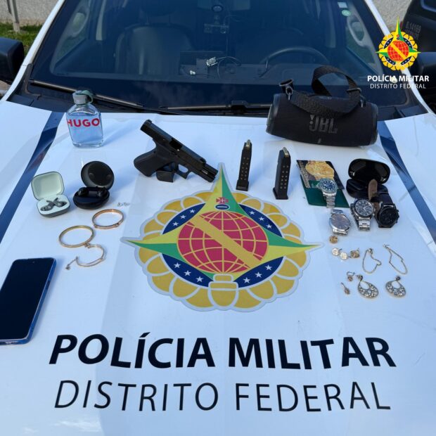 Na casa do suspeito, os militares encontraram uma pistola Glock G19, calibre 9 mm, escondida sob o travesseiro de um berço. No mesmo local, também foram recuperados joias, relógios e outros pertences pertencentes à vítima do furto.
