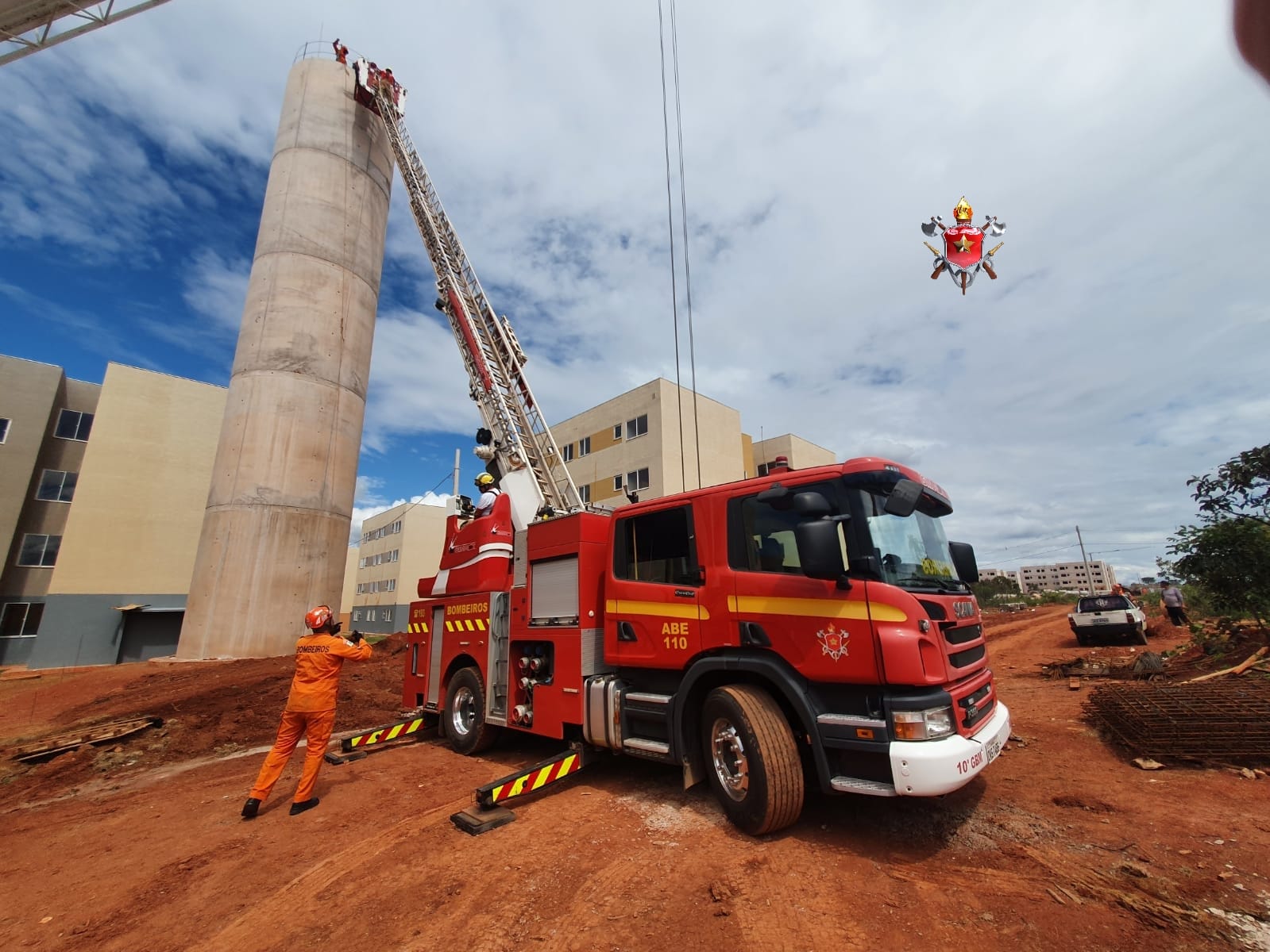 O Corpo de Bombeiros Militar do DF (CBMDF) foi acionado nesta sexta-feira para resgatar três operários presos em cima da estrutura da caixa d’água, no Itapuã Parque. A estrutura tem aproximadamente 22 metros de altura