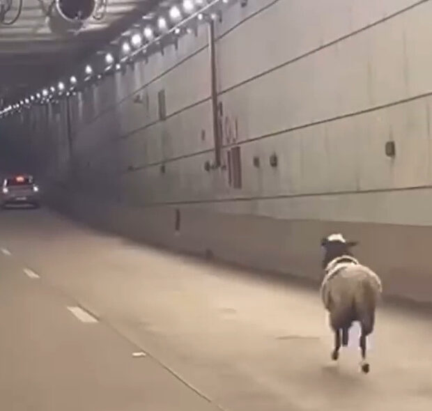 Nas imagens, é possível perceber que a ovelha aparenta estar assustada com o movimento intenso de carros e o ambiente fechado do túnel.