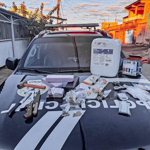 Apesar da tentativa de fuga do investigado, os policiais civis conseguiram localizar uma grande quantidade de maconha e seus derivados, crack, ecstasy e rohypnol (também conhecido como Boa Noite Cinderela), além de munições de diversos calibres na residência.