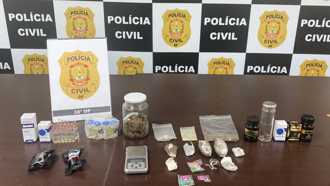 No local, os agentes localizaram anabolizantes, porções de maconha, cristais de MDMA, de metanfetamina, selos de LSD, além de comprimidos de mescalina e uma balança de precisão.