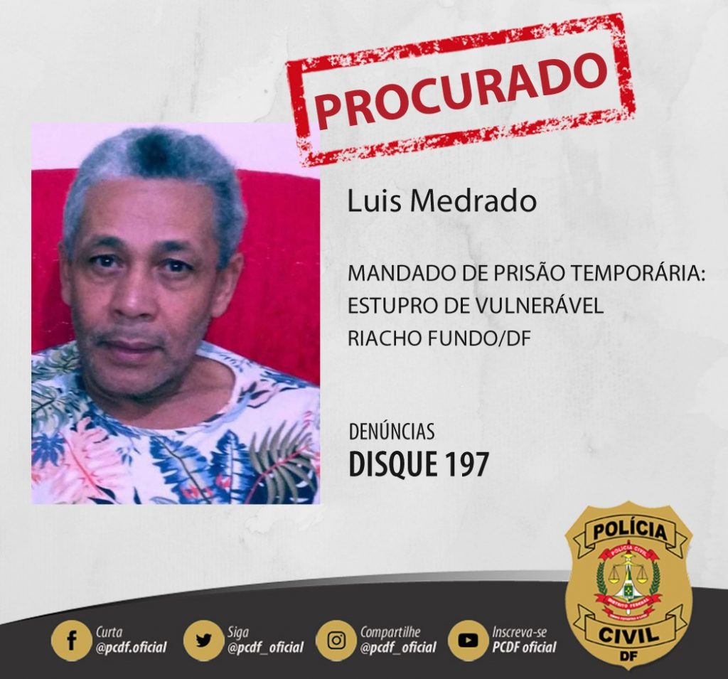 A Polícia Civil do Distrito Federal (PCDF) está a procura de Luís Medrado, de 56 anos, acusado de abusar sexualmente de uma criança de 10 anos. O crime teria acontecido no último sábado (04), no Riacho Fundo.