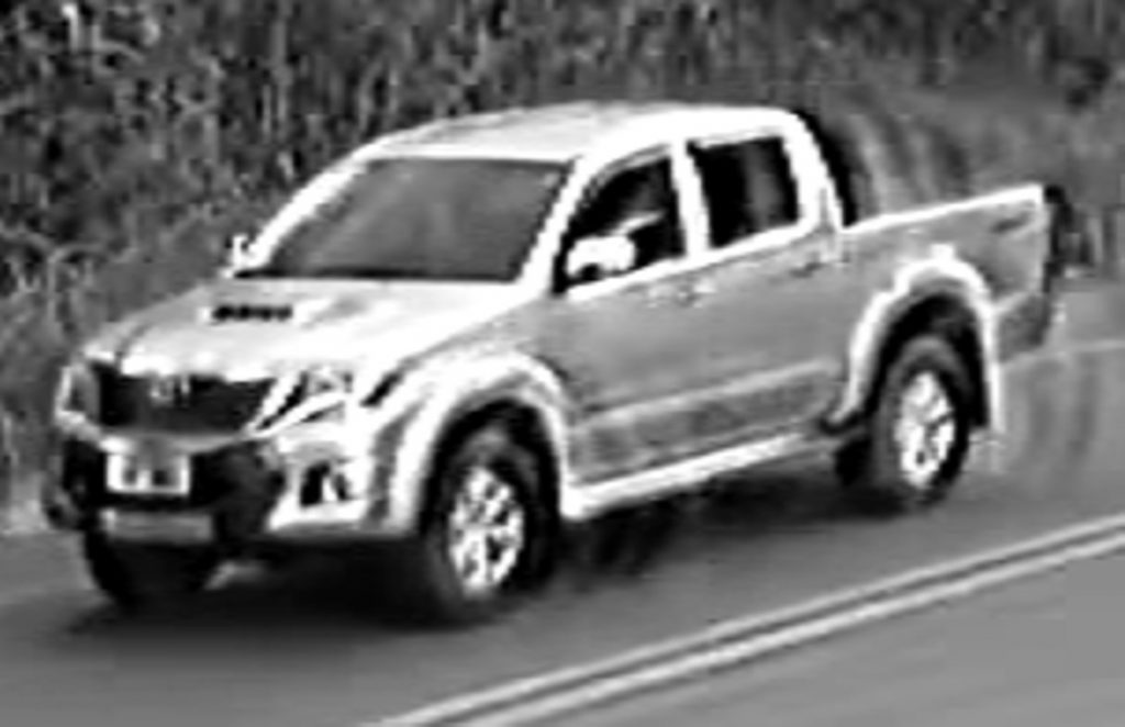 Trata-se de uma caminhonete Hilux, cor prata. De acordo com as autoridades, o veículo aparece 20 minutos próximo ao local do crime, na região do Café Sem troco. O automóvel da imagem aparece com a frente danificada, momento em que também não foi possível identificar a placa e o motorista.