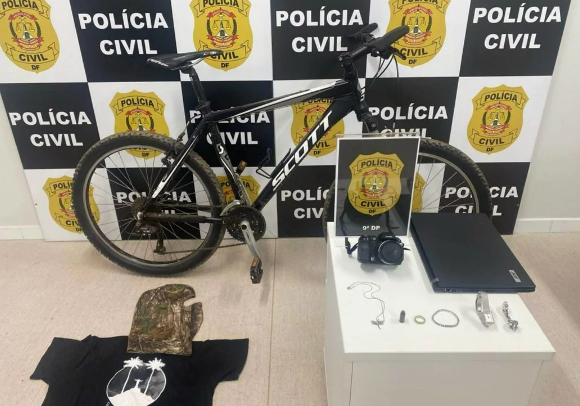 Em seguida à abordagem, a polícia dirigiu-se à residência do investigado, onde foram encontrados os demais objetos furtados: uma bicicleta de corrida profissional, um notebook, joias e outros relógios.