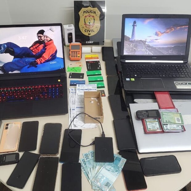 Durante a operação, os policiais apreenderam espelhos de contas de água da CAESB, comprovantes de renda falsificados, impressoras, chips de celular, notebooks, aparelhos móveis, cartões bancários em nome de terceiros, documentos falsos e outros materiais usados nas fraudes.