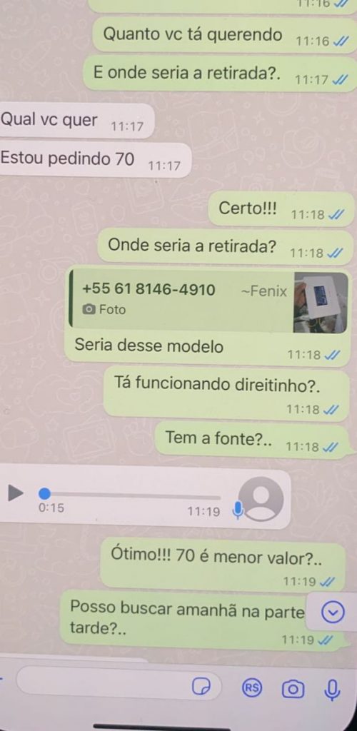 A mulher anunciava, em sua página do Facebook, a venda de modem de internet de empresas provedoras do serviço. A transação ocorreria em sua própria residência, em Vicente Pires. A detida contratava a prestação de serviços de internet e apenas pagava a instalação. Nos meses seguintes, após ter o serviço cortado, era anunciado a venda dos modems na internet, pela quantia de R$ 70,00,cada. O preço do aparelho no mercado é de aproximadamente R$ 450.