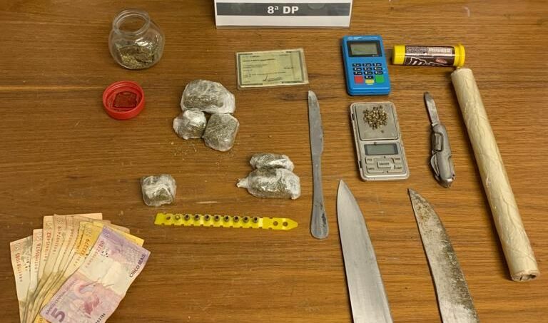 Os policiais adentraram o local e capturaram o traficante. Durante a revista no imóvel do jovem foram apreendidas pedras de maconha, dinheiro em espécie, balança de precisão, sementes de maconha, material para cortar e embalar a droga e uma maquininha de cartão de crédito.