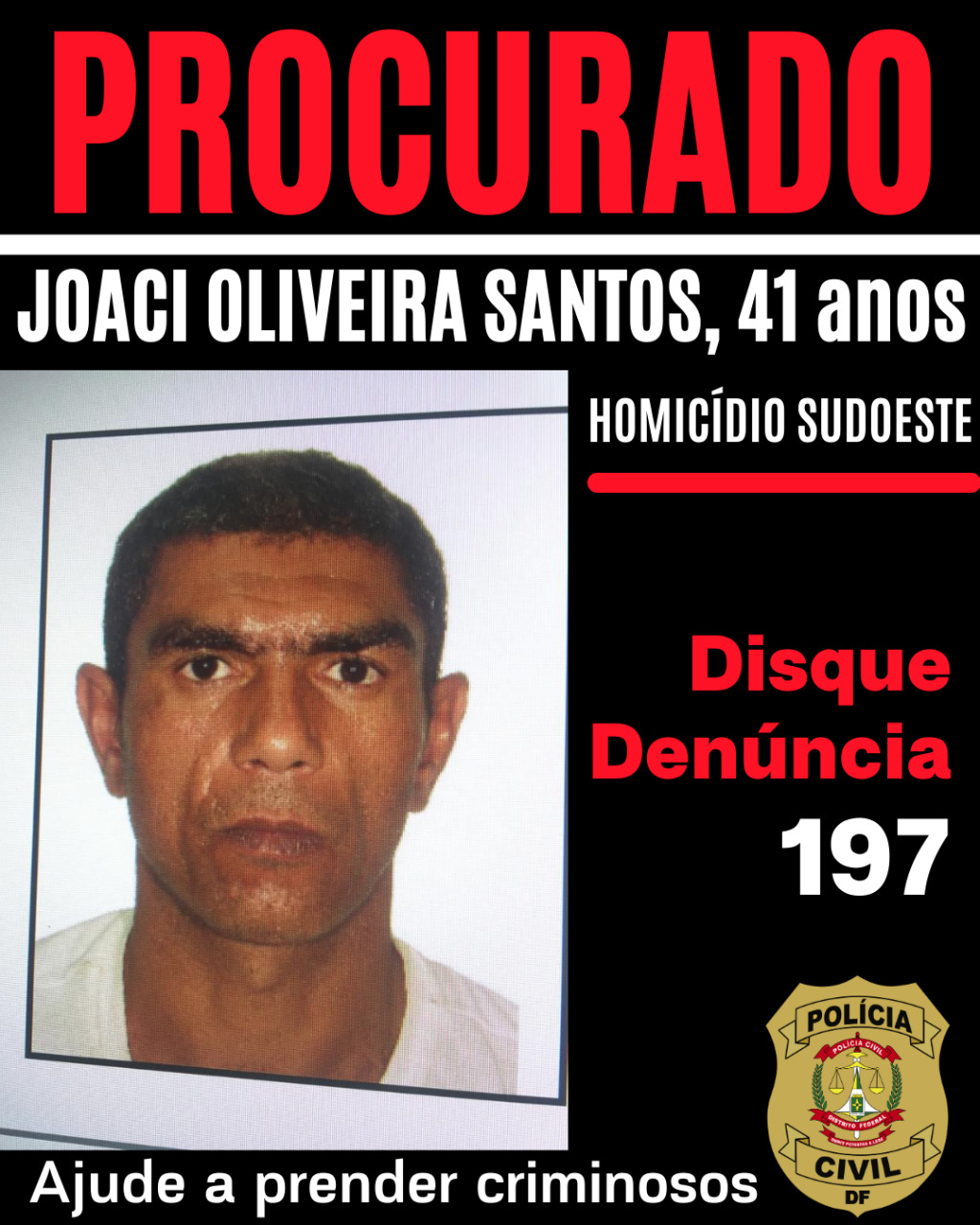 A Polícia Civil do Distrito Federal (PCDF), por meio da 3ª Delegacia de Polícia (DP), divulgou, nesta terça-feira (5), a imagem de Joaci Oliveira Santos, 41 anos, que está sendo procurado suspeito de ser o autor de um homicídio no dia 10 de dezembro de 2020 na quadra 101 do sudoeste, vitimando Júlio Cezar da Cruz Costa, o qual era conhecido por Juliana.