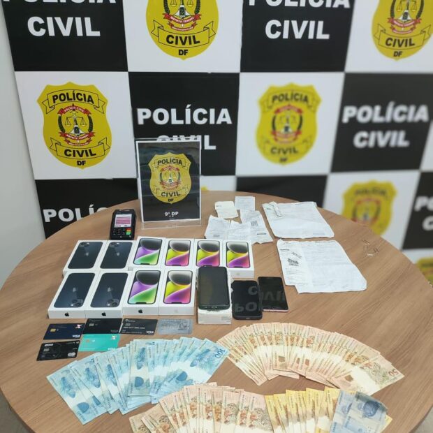 Ao aguardar a volta do suspeito, que é de São Paulo, na recepção do condomínio, os policiais o abordaram. Com ele, foram encontrados cinco iPhones modelo 14 Pro Max, ainda nas embalagens, recentemente comprados com os cartões das vítimas em um comércio de Taguatinga. No apartamento alugado, foram localizados mais cinco iPhones novos, máquinas de cartão, diversos cartões de crédito e dinheiro em espécie.