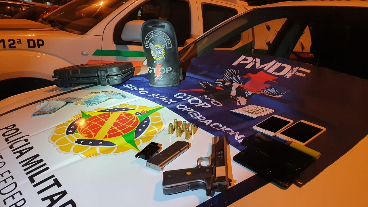 Os policiais militares prenderam um homem que transportava uma pistola calibre .45 em uma maleta na Rua 8, em Vicente Pires, na noite de sábado (22). Os militares apreenderam também R$ 1,9 mil e seis cartuchos de munição. O detido foi levado para a 12ª Delegacia de Polícia.