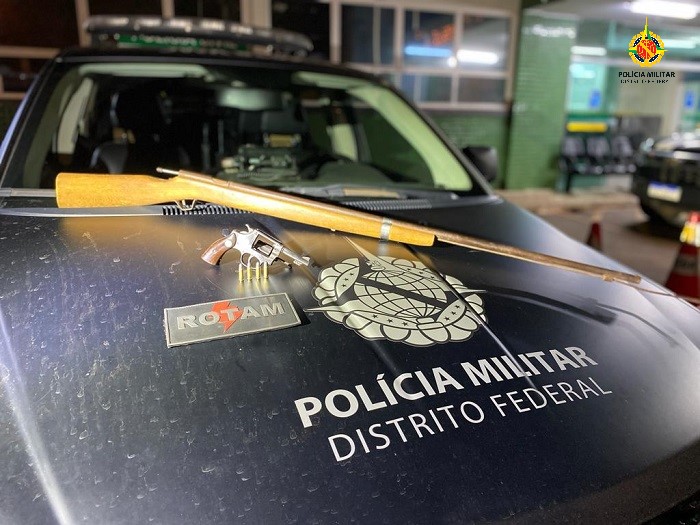 Já em Santa Maria, a PMDF apreendeu um revólver, uma espingarda e munições. As equipes de Rotam realizavam abastecimento em um posto de combustíveis na DF 290, quando viram um homem em atitude suspeita no interior de um carro. Os militares se aproximaram e abordaram dois homens.