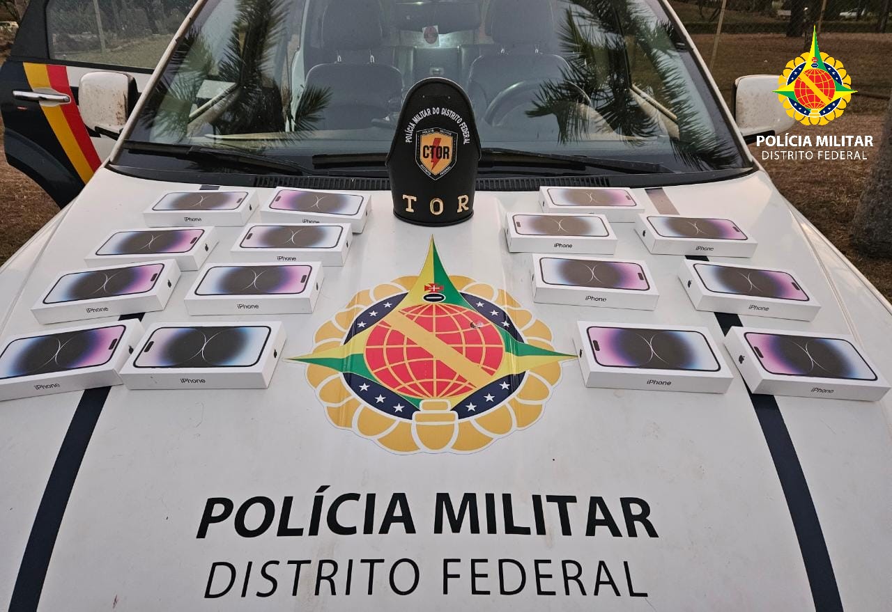 Ao ser solicitada a apresentação dos documentos, o condutor do veículo foi surpreendido pelos policiais ao encontrarem 15 aparelhos celulares da marca Iphone 14 Pro Max em uma das caixas. Questionado sobre o conteúdo e a origem das mercadorias, o motorista afirmou desconhecer o que havia nas caixas e não possuir nota fiscal dos produtos.