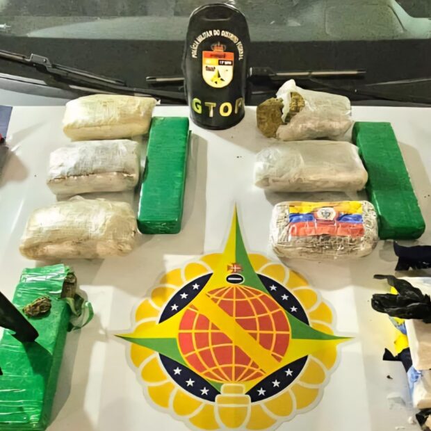 No interior da mochila foram encontradas três barras de substância esverdeada semelhante à maconha, seis tabletes com características de haxixe, além de uma barra, meia barra, uma porção grande e três porções pequenas de substância branca, possivelmente cocaína do tipo “escama de peixe”. Também foram apreendidas uma balança de precisão grande, duas balanças menores e vários materiais utilizados para fracionar e embalar drogas.