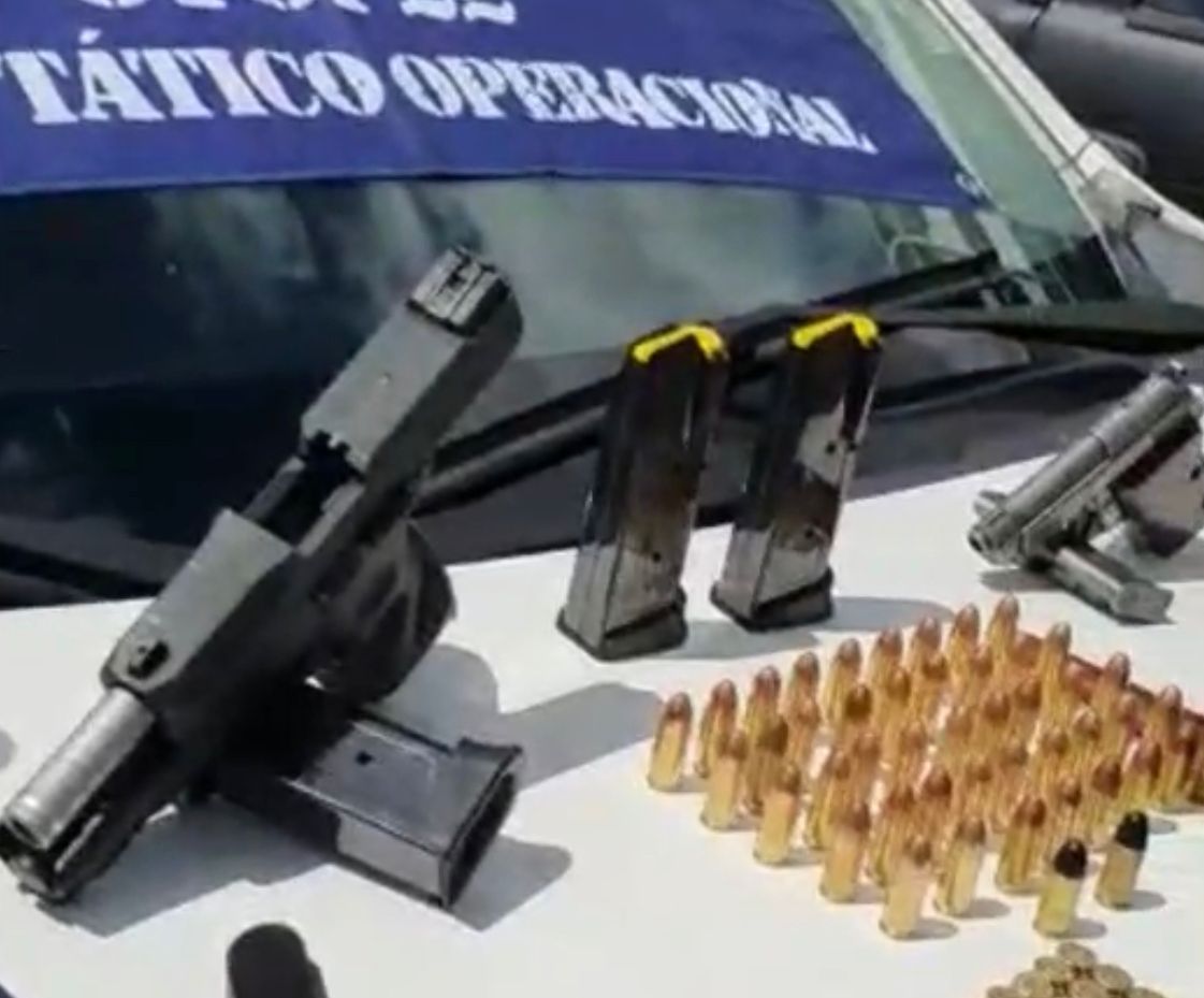 Ao chegarem no endereço, a proprietária do imóvel, que é a mãe do suspeito, tentou barrar o acesso, sem sucesso. Os policiais encontraram um revólver calibre .357, que estava registrado no nome do pai do suspeito, uma pistola .635, que disseram ter encontrado enquanto capinavam um lote, e uma G2c, que disse ser registrada, mas a documentação não foi apresentada. Também foram encontradas 20 munições.