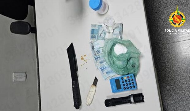 Com a chegada da equipe policial ao endereço indicado, foi realizada a abordagem dos envolvidos. Durante a vistoria no interior da residência, os militares encontraram diferentes tipos de substâncias entorpecentes, além de dinheiro em espécie e objetos perfurocortantes.