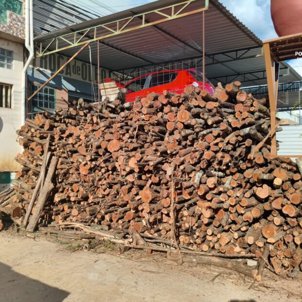 Durante a fiscalização, foram identificadas espécies nativas entre o material. Os responsáveis não apresentaram autorização do órgão ambiental competente para o transporte e o depósito do produto florestal.