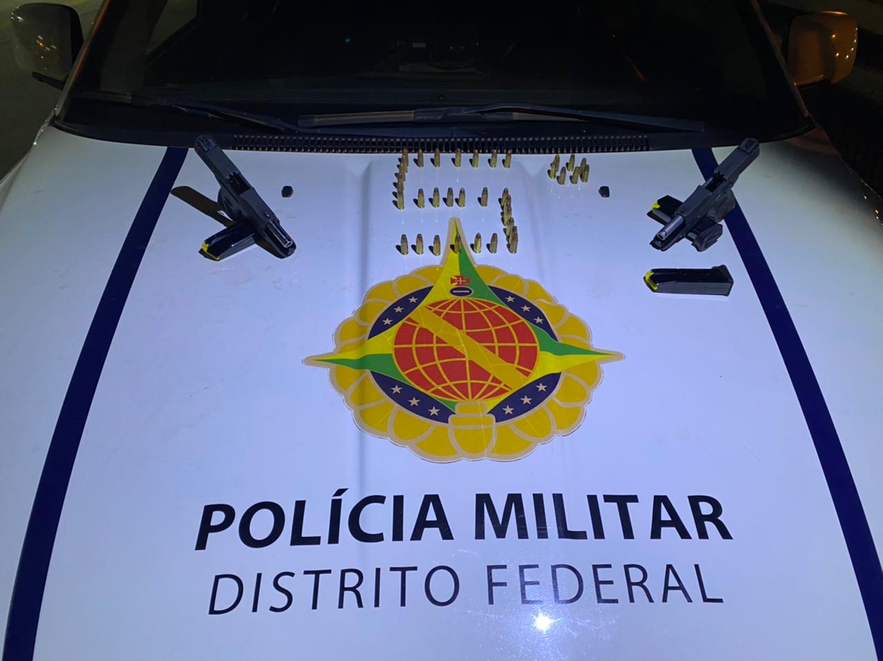 Foram apreendidas duas pistolas 9mm de uso restrito e 37 munições. Dois homens que portavam o armamento foram levados à 6ª Delegacia de Polícia (Paranoá) para serem autuados.