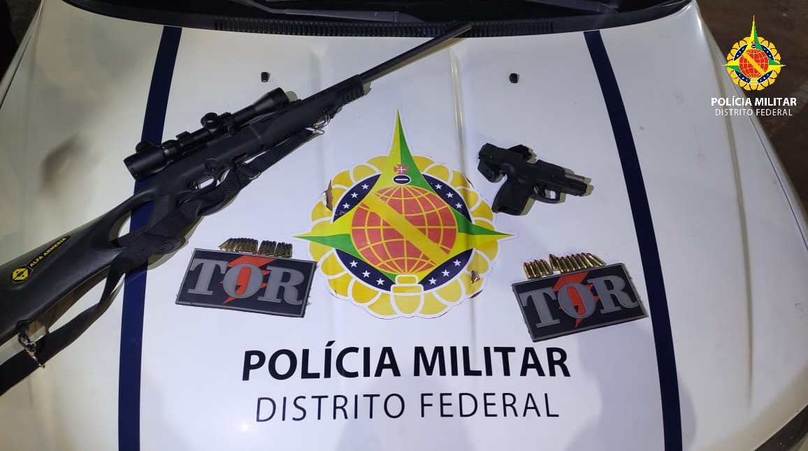 Após abordar um veículo com três ocupantes, durante uma blitz, foram encontradas uma pistola 9mm, uma carabina calibre 22 e 25 munições.