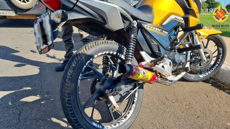 Além de ter sido flagrado com um escapamento adulterado, o condutor foi autuado por estar inabilitado para dirigir motocicletas, bem como por circular com luz de placa queimados e farol de led.