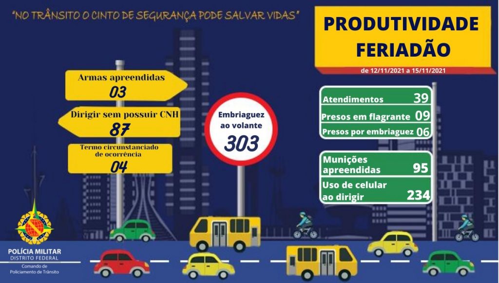 Além dos flagrantes de embriaguez, as unidades de trânsito da PMDF notificou 237 motoristas por dirigir usando celular e 87 por estarem sem carteira de habilitação. Agentes ainda apreenderam três armas de fogo.