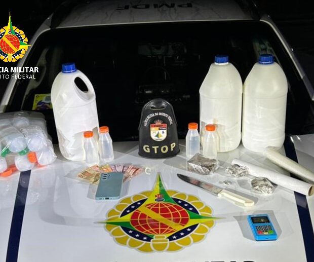 Durante a intervenção policial, um usuário de entorpecentes também foi detido no local. Nas buscas, os militares encontraram grande quantidade de substâncias ilícitas, entre elas dois galões de cinco litros completamente cheios de lança-perfume, um galão vazio e quatro frascos menores contendo a mesma droga.