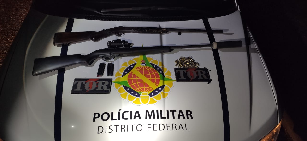 Foi localizado dentro do veículo duas armas de fogo, um rifle CBC cal.22, equipado com supressor de ruído e mira red dot, uma espingarda calibre .36 e 69 munições de cal.22.