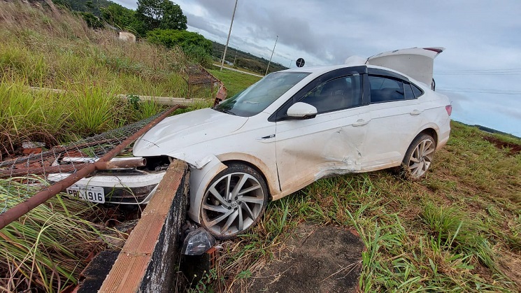 Próximo ao balão da Barragem, o condutor do Veículo VW Virtus perdeu o controle e colidiu contra um poste e uma mureta de proteção da rodovia, onde veio a parar.