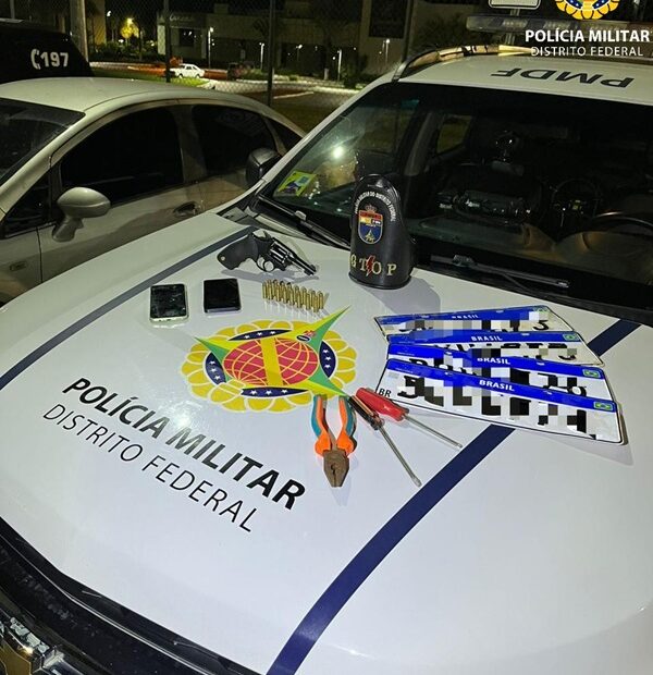 No interior do automóvel também foram apreendidos dois pares de placas automotivas. Após consulta, foi constatado que um dos pares possuía registro de furto, enquanto o outro apresentava indícios de fabricação clandestina. Ferramentas como chave de fenda, chave Phillips e alicate também foram recolhidas.
