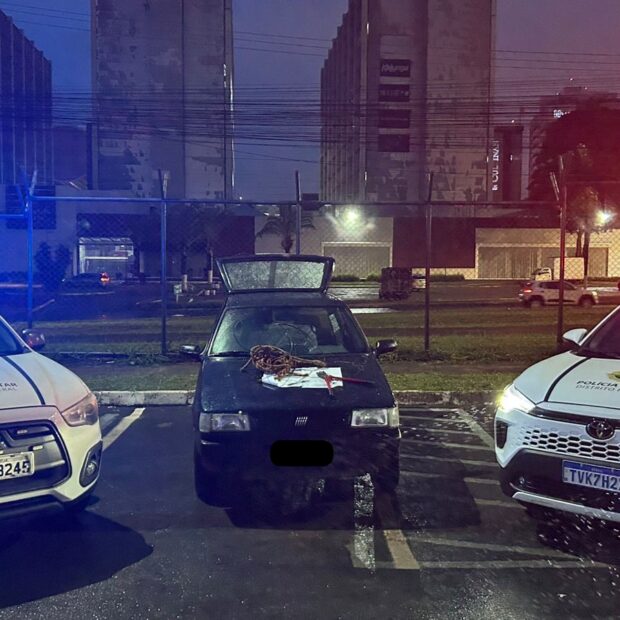 Durante a varredura no local, as equipes localizaram uma chave-micha e um alicate de grande porte, instrumentos normalmente utilizados em crimes contra o patrimônio. Em diligências complementares, já na Quadra 300B, foi encontrado um veículo Fiat Uno, de cor verde, com sinais de arrombamento na porta e na ignição.
