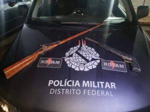 Em Brazlândia a equipe de ROTAM patrulhava no Núcleo Rural Café sem Troco, quando percebeu que vários homens que estavam na frente de uma casa, ao avistarem a viatura, ficaram nervosos e entraram na residência. Os policiais localizaram na frente da casa duas munições calibre .28 e decidiram abordá-los. No interior da residência, embaixo do sofá foram encontradas duas armas caseiras. Um dos abordados assumiu a propriedade. O suspeito foi conduzido para à 6ª Delegacia de Polícia.