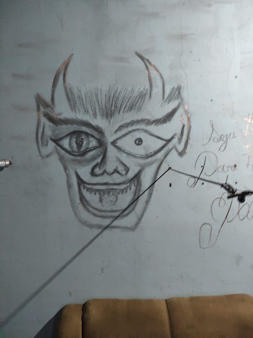 Os agentes informaram que o local do crime tinha desenhos de um demônio, junto ao número 666 e ainda um cartaz de uma série de terror (Me Conte uma História).