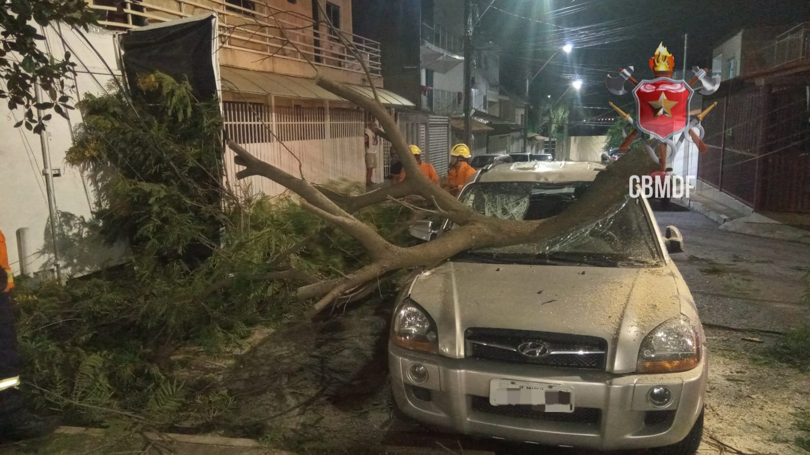 Dois veículos foram deslocados para a Quadra QS 16, Conjunto “1C”, onde uma árvore tombou sobre um poste de iluminação e transmissão de energia elétrica, atingindo em seguida um veículo do tipo S.U.V. Hyundai/Tucson, de cor prata, estacionado na via pública.