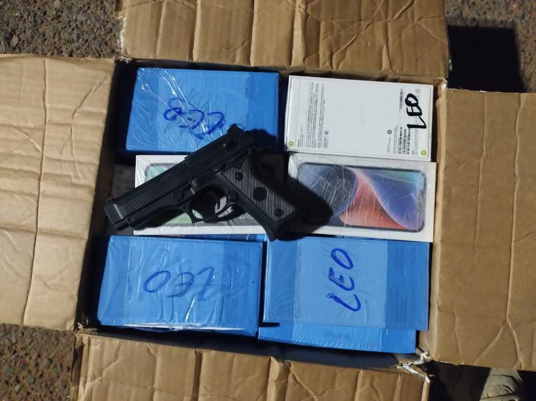 Na vistoria foram encontrados no interior da cabine 19 Iphones 14 PRO MAX, de 256 GB e 12 Iphones 14 de 128GB. Além da mercadoria, foi encontrado um simulacro de arma de fogo.