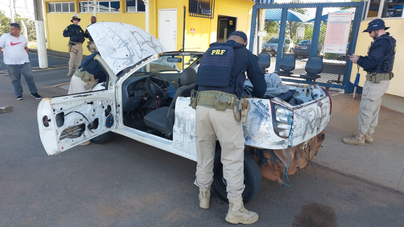 A equipe da PRF avistou um veículo Fiat/Palio, transitando com várias alterações, entre elas sem o teto e a placa traseira de identificação. Foi dado ordem de parada ao condutor e iniciaram os procedimentos de fiscalização.