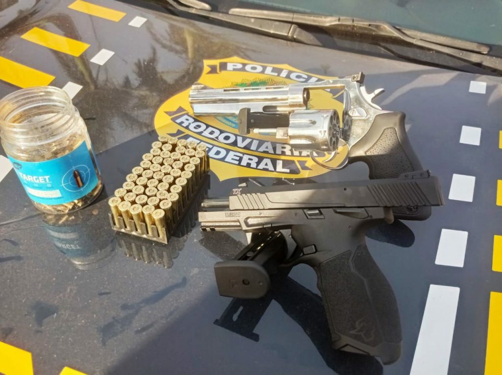Na tarde de domingo (6), uma equipe de PRFs observou uma VW Amarok branca realizando ultrapassagem proibida na BR 020, próximo a Formosa/GO. Imediatamente os policiais ordenaram a parada do veículo. Na abordagem o condutor mostrou-se nervoso quando perguntado se havia algum ilícito no carro. Em revista, os agentes encontraram uma pistola Taurus calibre .22 com 196 munições e um revólver .38 com 52 munições. Um dos passageiros, de 49 anos, assumiu ser dono das armas, mas não possuía autorização para portá-las. Ele foi preso e encaminhado à Central de Flagrantes de Formosa.