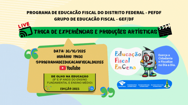 Com o intuito de unir arte e cidadania, professores e estudantes da rede pública do DF participam do Projeto Educação Fiscal EnCena!, que promove apresentações virtuais nesta terça (28), às 19h, e na quinta (30), às 19h30. As lives exibirão produções artísticas baseadas em temas como responsabilidade social e consciência cidadã, incentivando a reflexão sobre o papel do contribuinte no financiamento das políticas públicas. A primeira transmissão será voltada a alunos do 4º ao 7º ano do ensino fundamental, e a segunda, a estudantes do 8º e 9º anos e do ensino médio.