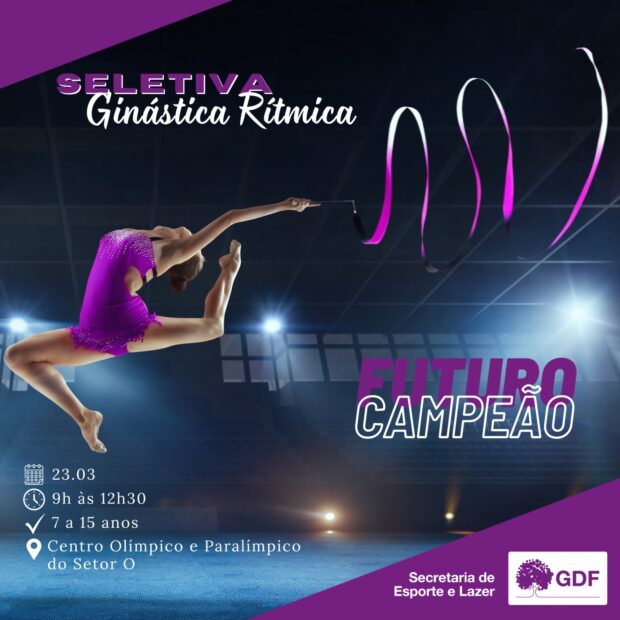 A Secretaria de Esporte e Lazer do Distrito Federal (SEL-DF) abriu inscrições para a seletiva de ginástica rítmica do projeto Futuro Campeão. A peneira está marcada para sábado (23), das 9h às 12h30, no Centro Olímpico e Paralímpico (COP) do Setor O, em Ceilândia. Ao todo, serão oferecidas 30 vagas, destinadas a meninas com idade entre 7 e 15 anos.