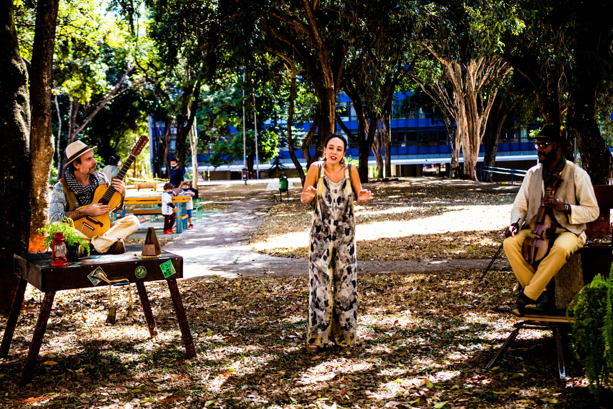R.C.Ballerini é músico, escritor e piloto de ideias. Idealizador deste projeto, compositor, instrumentista e arranjador, seu instrumento principal é a Viola Caipira. Thiago Ribêiro é músico, professor da Escola de Música de Brasília. Instrumentista e arranjador, seu instrumento principal é a Viola da Gamba. Naira Carneiro é atriz, bailarina e contadora de histórias, co-fundadora do grupo Os Buriti.
