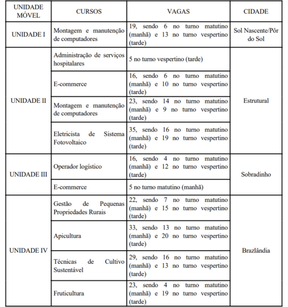 Os interessados poderão se inscrever pelo portal da Secretaria de Estado de Trabalho ou de forma presencial, nas Agências do Trabalhador, até sexta-feira (4). Confira a disposição das vagas do Qualifica DF Móvel: