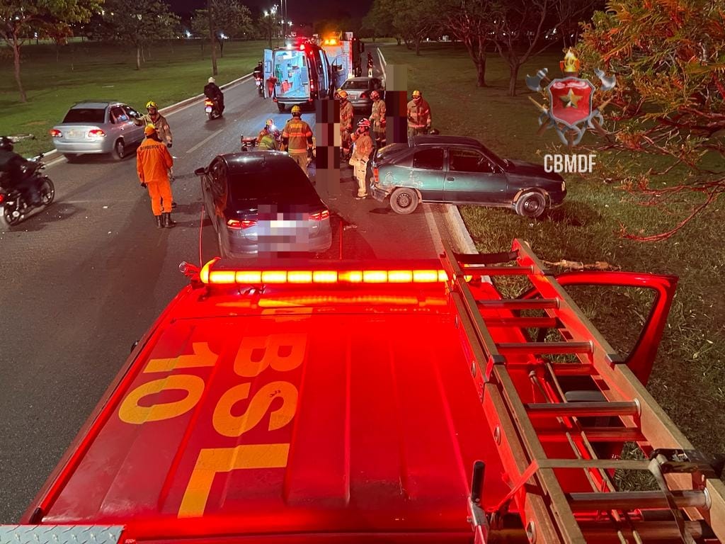 Uma colisão entre dois veículos na L4 Sul, no sentido centro de Brasília para o Zoológico, resultou em quatro pessoas feridas na noite de terça-feira (12). O Corpo de Bombeiros Militar do Distrito Federal (CBMDF) foi acionado para prestar assistência às vítimas, mobilizando quatro viaturas em resposta ao incidente, que ocorreu às 19h57.