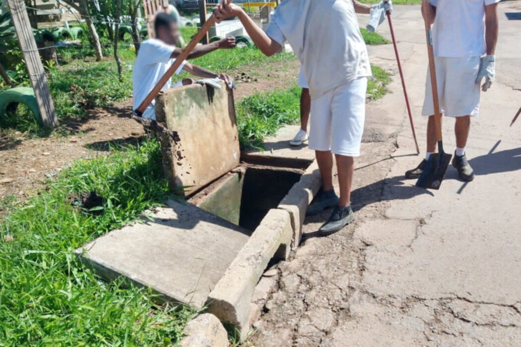 Durante esta semana, cerca de 80 bocas de lobo foram limpas e desobstruídas no Pôr do Sol e no Sol Nascente. A equipe de limpeza contou com o reforço de 15 reeducandos do programa Mãos Dadas, da Secretaria de Administração Penitenciária (Seape).