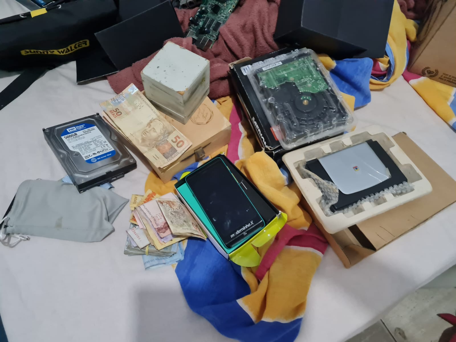 Diversos equipamentos de informática ligados à central de distribuição de sinal de internet, os quais serão periciados pelo Instituto de Criminalística, para a continuidade das