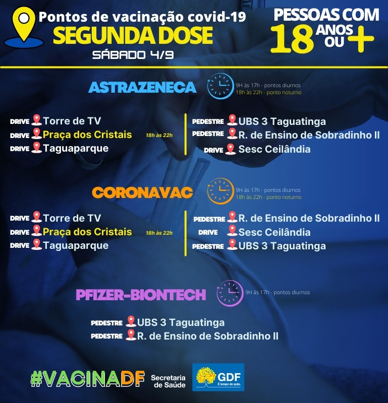 Mantendo a vacinação em ritmo acelerado e funcionando durante todo o fim de semana, o Distrito Federal já tem mais de 2 milhões de pessoas vacinadas contra a covid-19. São 78,34% vacinados com a 1ª dose, 28,38% com a segunda e 33,60% com a dose única. Para quem ainda não se vacinou, mas se encaixa na fase atual, que está vacinando pessoas acima dos 18 anos, o Governo do Distrito Federal (GDF) divulgou quais pontos estarão abertos nos dias 4 e 5. Confira: